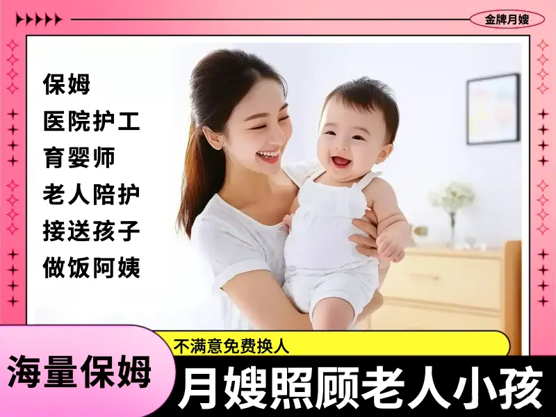 我公司提供保姆,月嫂,育婴师,护工,钟点工,陪护,接送孩子,保姆陪护钟点工,住家,保姆月嫂,保姆育婴师月嫂钟点工,做饭阿姨,不住家,单位做饭,安排就近阿姨为您服务!