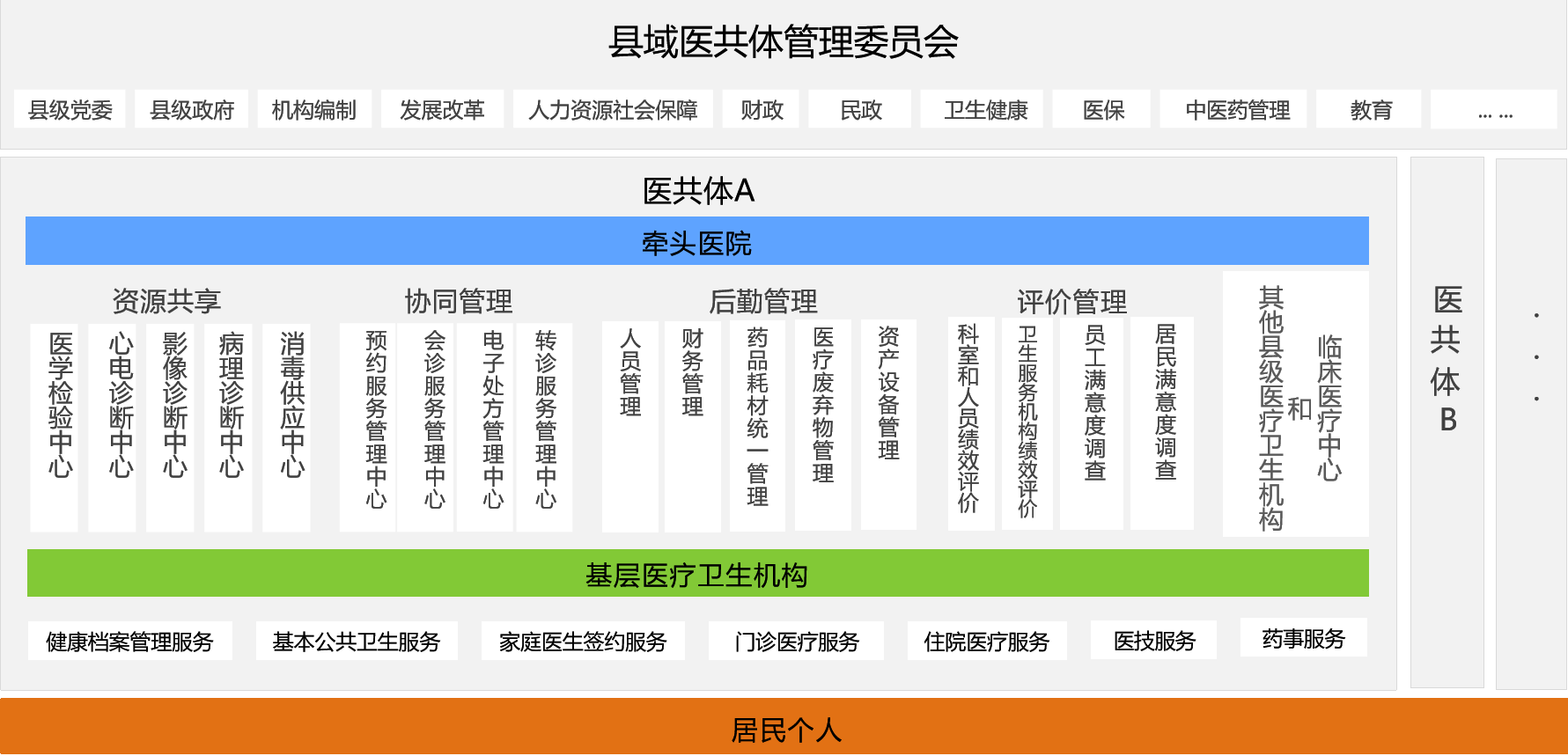 | 根据2020年发布的《县域医共体信息化建设指南》,医共体业务框架如图,即在县域医共体管理委员会的组织下,县域内可以有多个医共体,单个医共体由牵头医院牵头连接基层医疗卫生机构为居民个人服务。 |
