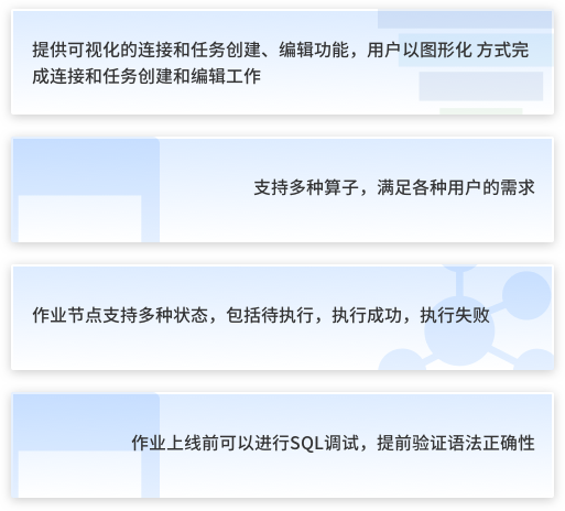 提供数据管道、实时计算、多维分析、业务流程、调度运维等数据加工处理端到端的工具集;支持复杂的数据处理模型构建;提供一站式可视化开发与管理界面,支持全托管的作业调度与灵活的调度策略;具有良好的扩展性,支持算子、函数及作业的自定义开发,极大地降低了用户构建数据处理的复杂度,专注于数据价值的挖掘和探索。
