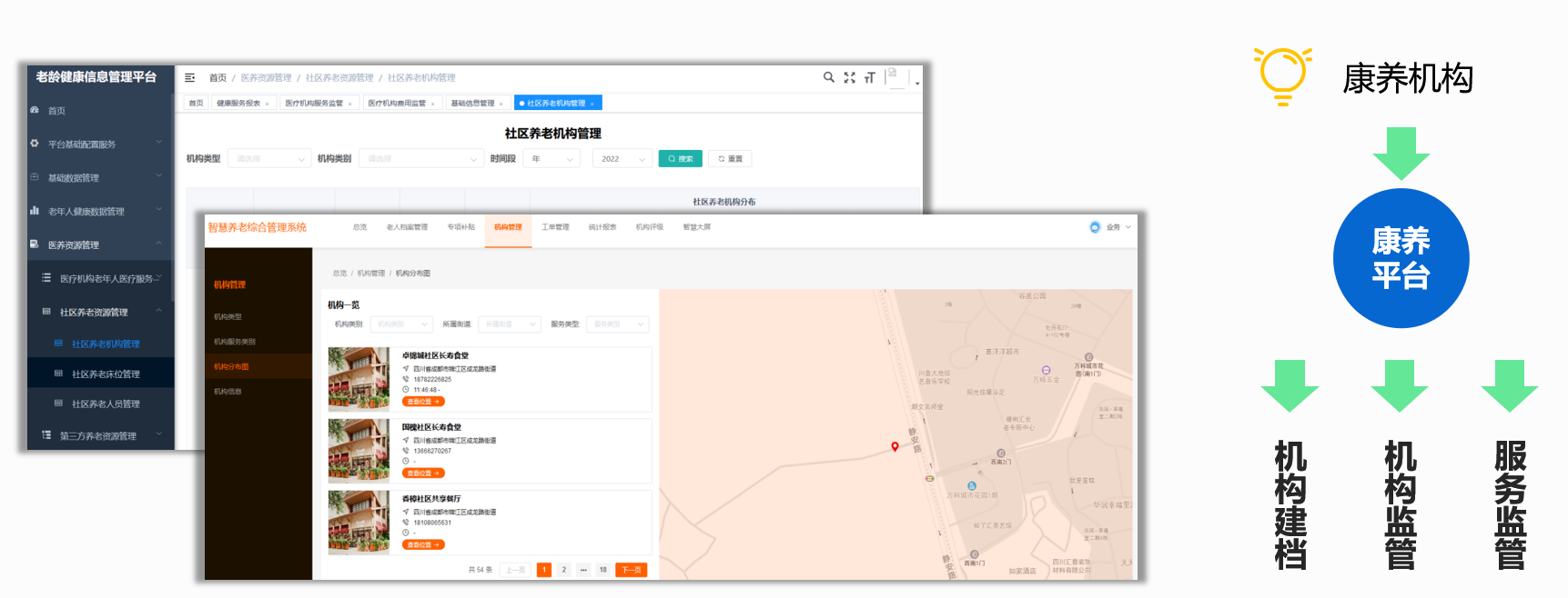 对区域内养老机构、机构服务进行管理和建档,统计区域养老机构数据,对床位、养老服务类型、数量等进行监管,并进一步对养老服务质量进行监管,并支持一键定位养老机构。