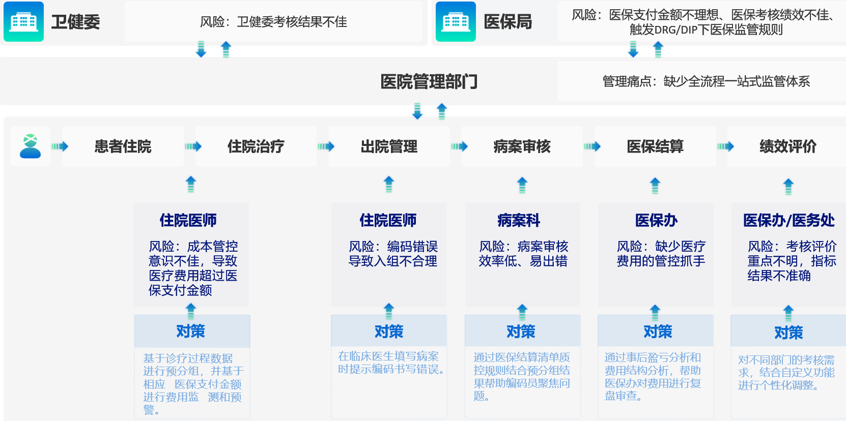 医院管理痛点、风险及对策根据当前医院面临的问题,从患者入院到出院医保结算,全流程监控风险点并给出对应解决方案。 |